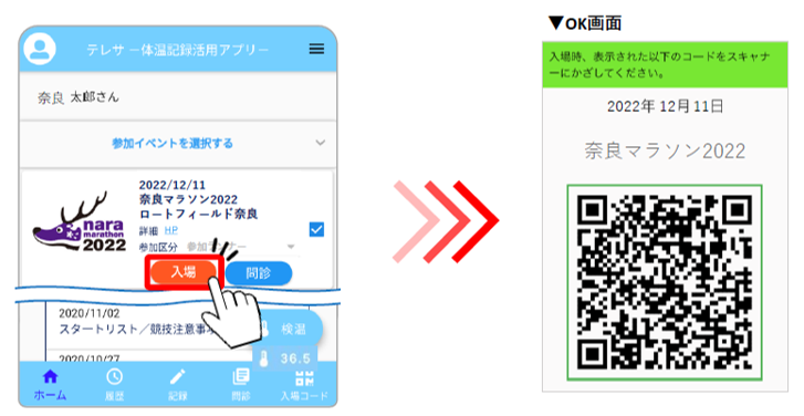 ↑大会当日(11日)、体温入力後、問診で「はい・いいえ」で答える重要質問(5つ)にすべて「いいえ」と答え、入場ボタンをタップすると、緑色の入場コードが出ます。こちらを提示していただいて参加OKです。